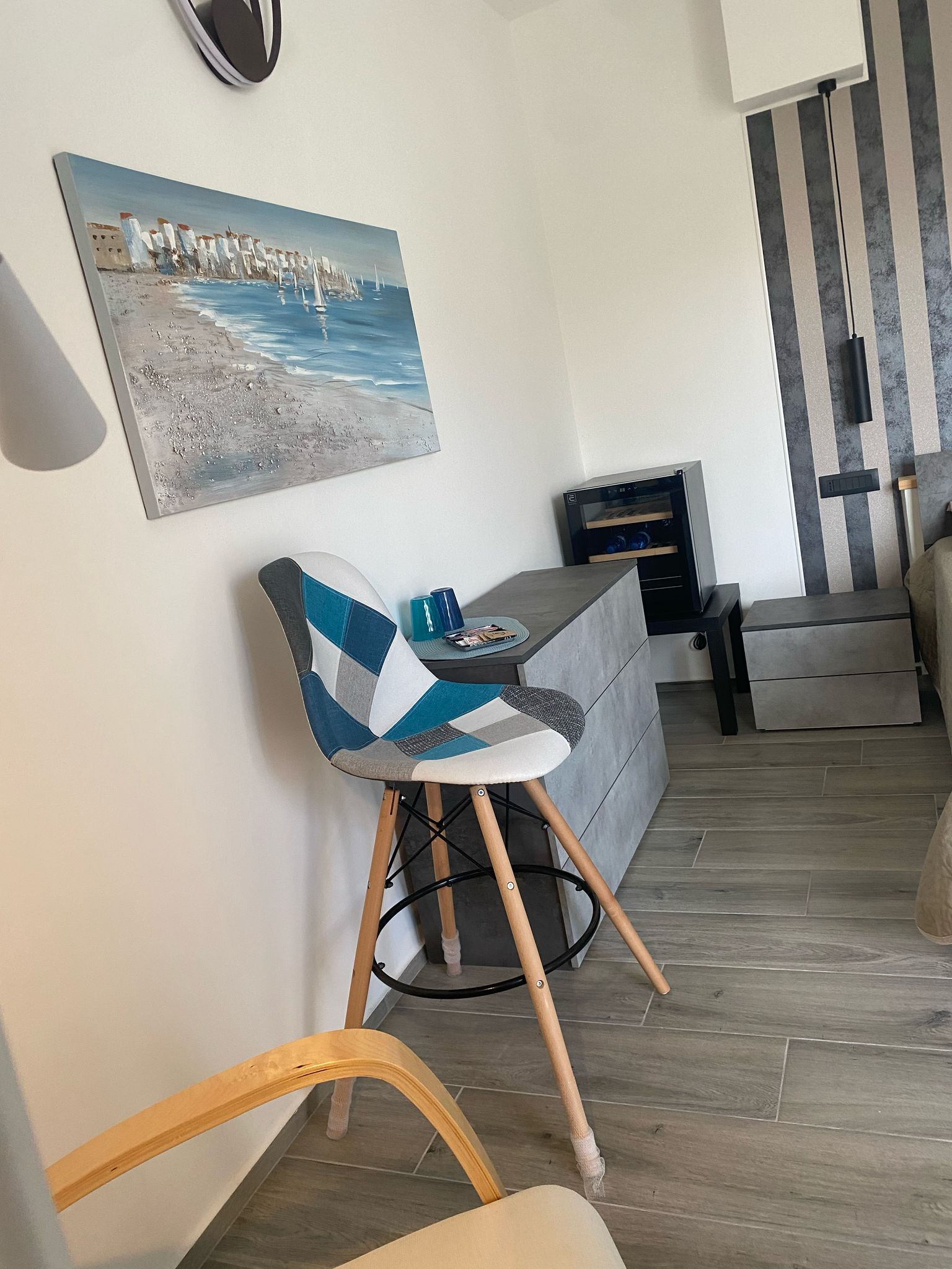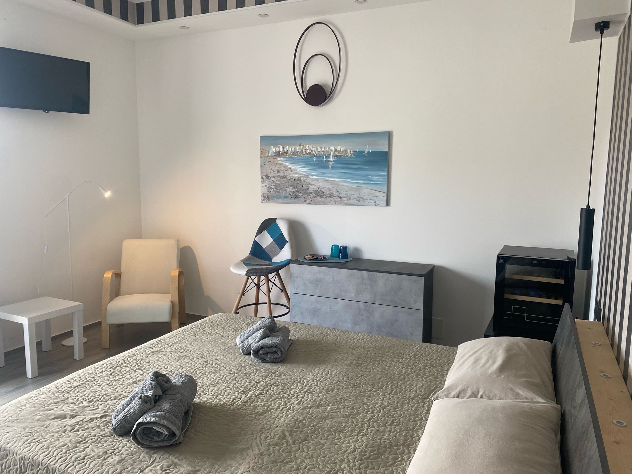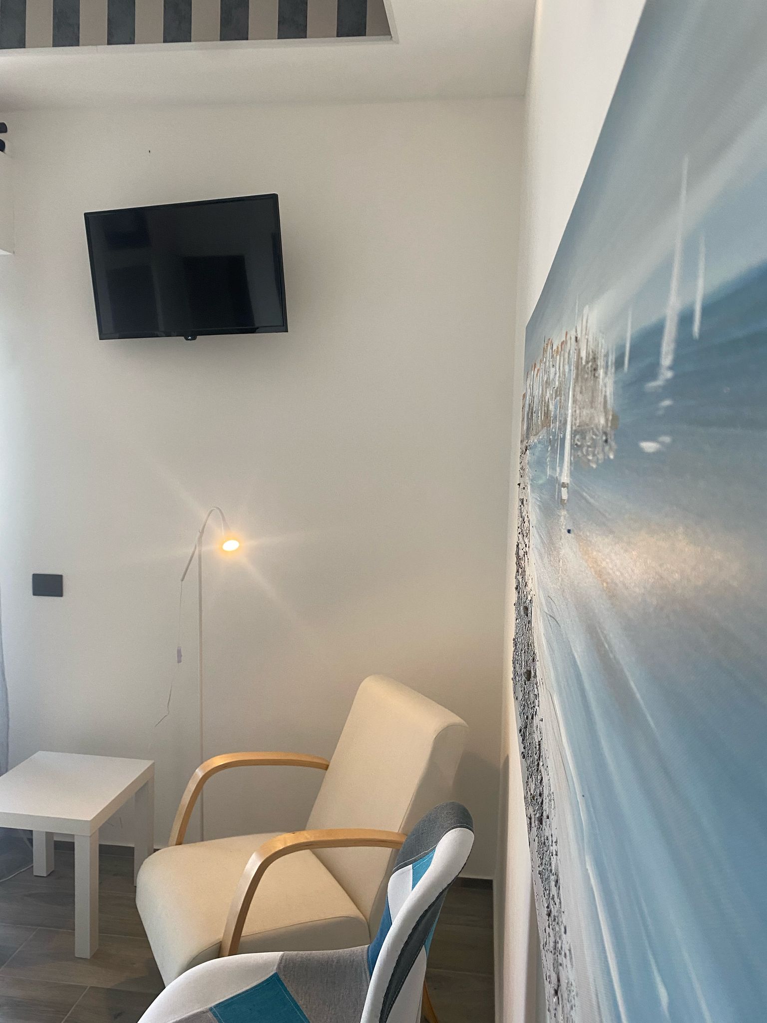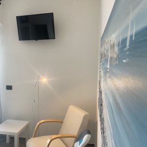 Arredata con una cassettiera, un moderno appendiabiti in nicchia, due sedie con tavolino e lampada, la stanza è anche dotata di TV a schermo piatto, WiFi, frigobar, aria condizionata, cassetta di sicurezza, tapparella elettrica con telecomando.